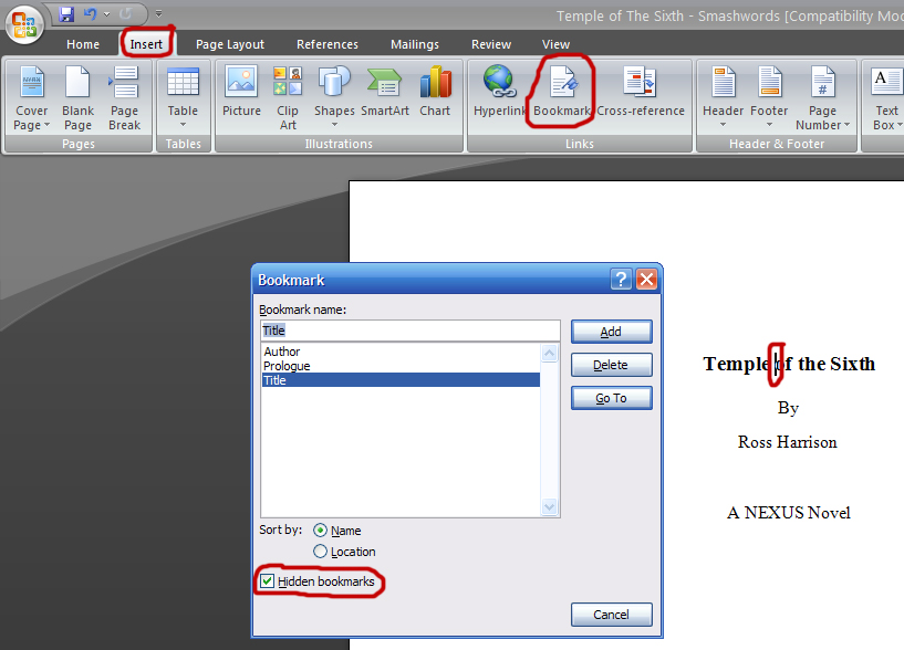 - Click somewhere in the title text and then go up to the Insert tab, then in the ‘Links’ section, about halfway across the toolbar, click Bookmark (If you’re not using Word 2007 or later, then you just go to Insert > Bookmark…