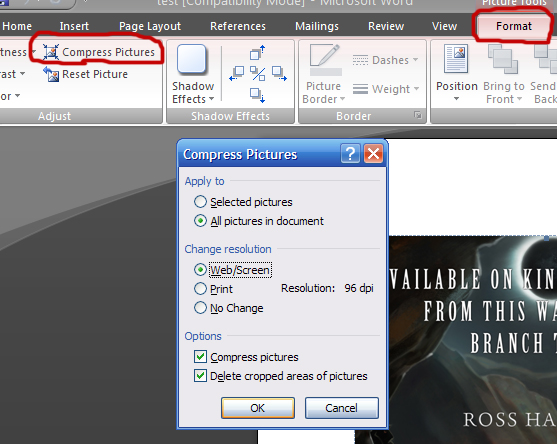 - With your image still selected, go to the top left of the Format tab and click Compress Pictures