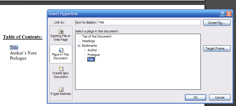 NOTE: If for any reason you want external hyperlinks, perhaps to somwhere where all of your books can be purchased, use the same Ctrl+K method, except that you’ll click on Existing File or Webpage