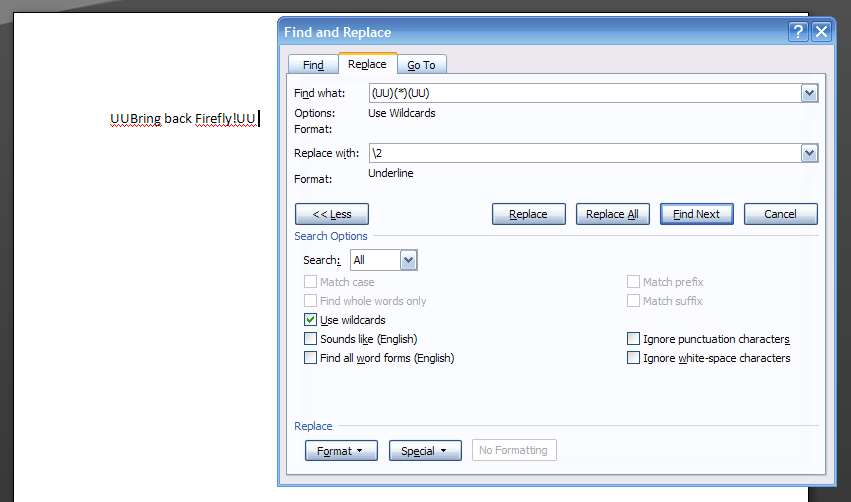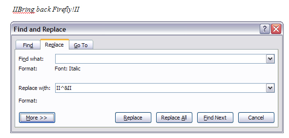 The reason I say ‘something like’ is that it’s the ‘^&’ that’s important. It simply refers to whatever is in the Find box. In this case, it’s simply whatever font formatting you have chosen. So now your italics will have ‘II’ on either side, and ‘UU’ and ‘BB’ respectively for underlined and bold. So ‘Bring back Firefly!‘ will now say ‘IIBring back Firefly!II‘. As you’ve guessed, we’ll do something similar after the nuclear option to reverse that. You can change ‘II’, ‘UU’ and ‘BB’ to whatever you want. It could say ‘JamesEarlJones’ and so long as you have the ^& in the middle, it will work.