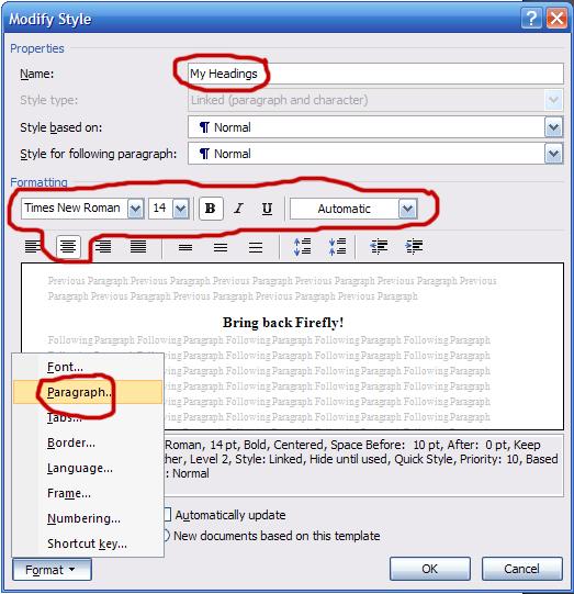 That’s the first style defined. Not hard. I actually created two Heading 2 styles, as I wanted my title to be slightly larger than the chapter headings, and I wanted those to be left aligned, not centred. If you want to do the same, then in the ‘Styles’ box from step 1, go right to the bottom and click on the left button showing two ‘A’s with what appears to be a little sun behind them. Then select ‘Heading 2’ beside ‘Style Based On’, give it an obvious name (like ‘My Title’) and then change your font size. We’ll be doing other styles by this method, so if that confused you, leave it until later.