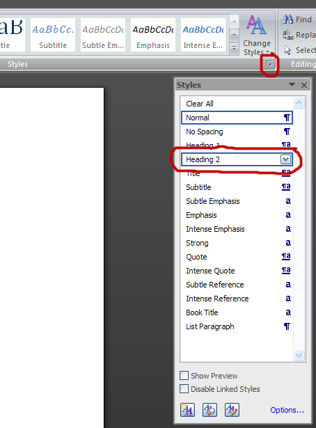 - In the Styles section of the toolbar, there is a darker strip at the bottom. At the end of that strip is a little arrow. Click this for a new box titled ‘Styles’ to pop up