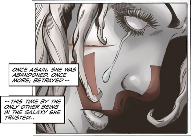 Trill is searching for Xesh. She remembers their childhood. Even as children, the slaves of the Rakata were brutal to each other. She used her untrained Force powers to put down the leader of their little pack when he challenged Xesh. From there, they swore blood oaths to each other, vowing to always protect each other. But the brutality of the Rakata would not allow these oaths to be kept. For the Rakata’s pleasure, they would later pit the two against one another in a fight to the death. Xesh defeated her, but persuaded his Predor that she should be a gift to the high Predor, as she would make a decent Force Hound. To Trill, denying her a ‘good death’ is an even worse betrayal, but it seemed to me as though this was the only way Xesh knew of protecting her. This was actually a pretty sad scene, and made me feel sorry for Trill. The art and the writing here makes her devastation, rage and hate come alive. She locates Xesh, and sets a course.