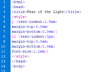 Paragraph indenting is simple to set up. We’re going to replace the style section that we deleted earlier. Go back to the top and, in between the title closing tag and the body opening tag, put in the following: