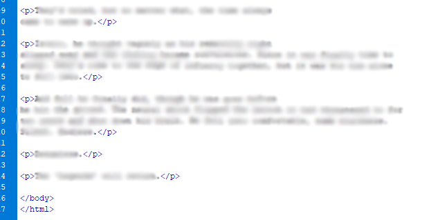 Next comes a simple but time-consuming process. We need to delete all of the unnecessary code. In the following bits of code, yours may read slightly differently to mine, so make sure to copy and paste from your own file and not this guide. At the moment, what we’re aiming for is to leave every paragraph with only the p tags on either side.