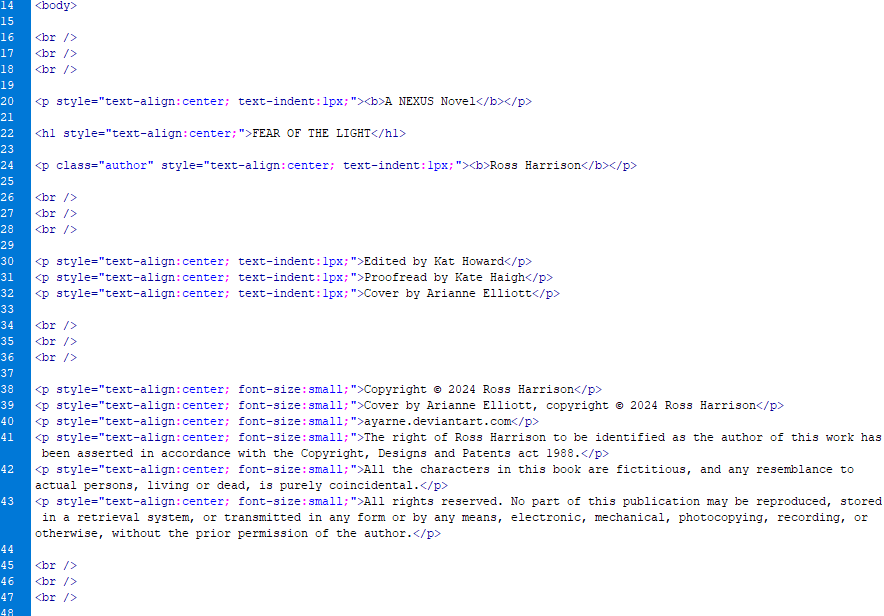 Next, you’ll want some blank lines. We will do this with <br />, but this is only a stepping stone – we’ll actually change them again once we get to Calibre, because the br tag isn’t supported everywhere. You may want one of these tags or two, or maybe even three. In front of my title and copyright information, I’ve used three each to push said bits of content down the page to be more centralised. This doesn’t work with every e-reader, which will sometimes ignore more than one blank line.