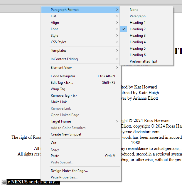 I have found that the fastest way to make this change, without having to deal with extraneous p tags, is to simply view the book from the Design view in Dreamwaver (if your editor doesn’t have the ability to show you the finished version instead of the code, you’ll just have to do the work to replace every p and b tag around your chapter headings manually). Scroll through the book on the Design side and find your headings. Highlight them, right click, and then change formatting to Heading 2 or whichever heading style you’ve chosen: