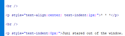 The problem with this is that, in fiction, the first paragraph after a break shouldn’t be indented. What we just did says that the indent should occur every time the paragraph tag is used. To get around this, you can go to the first paragraph tag after every chapter or line break and change that first tag: