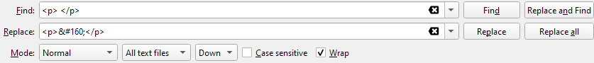 or (replace these with ‘<br />’ – I’ll mention this again later)- You may also have random instances of a p tag opening and immediately closing without anything in between, or perhaps a space between. These should go, too.
