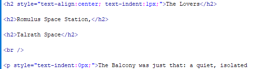 In this example, ‘The Lovers’ is the name of part one of this book. It will be on it’s own page (again, we’ll create page breaks later), but otherwise you can see from this code that it will be the same size as the chapter headings, but it will be centred, whereas the chapter headings will not. Obviously, if you want your chapter headings centred, you can copy that code from ‘style’ to the closing quotations (I actually don’t remember at this point why I have a text indent of 1px – you can probably do without that).