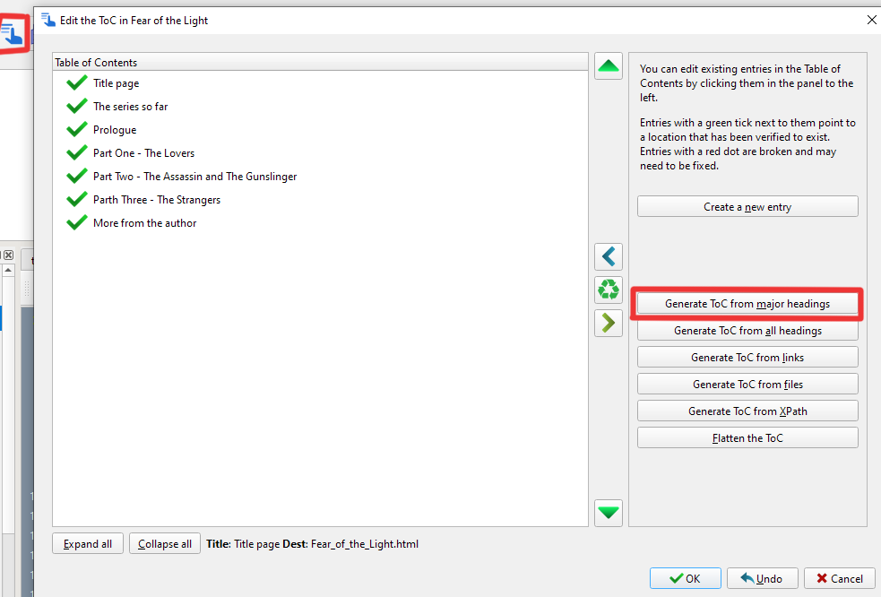 - You can use the options on the right to automatically create your TOC using the heading tags we added in HTML, create a new entry using every file we just created, or your can manually enter them
